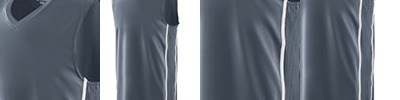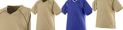 6 oz., 50% polyester, 50% cotton jersey knit; Contrast color 1x1 rib-knit V-neck collar; Contrast color sleeve inserts with accent stripes; Set-in sleeves; Double-needle hemmed sleeves and bottom;