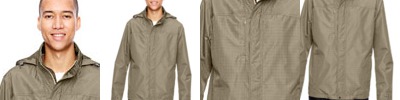 2.5 oz., 100% polyester yarn-dyed check; LINING: 100% polyester printed mesh in front and back body; 100% polyester taffeta in sleeves ; roll-away hood with adjustable shockcord; inside placket; storm flap with metal snaps at top and bottom; center front autolock zipper with rubber toggle; adjustable cuffs with tabs and metal snaps; adjustable shockcord at drop back hem with access through front pockets; right-chest concealed invisible zippered pocket; lower concealed autolock zippered pockets with rubber toggles;