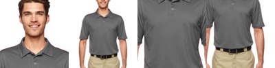100% polyester pique, 4.3oz./yd2/145gsm; Moisture wicking, antimicrobial and UV protection performance; Matching flat knit collar; Contrast color neck tape;