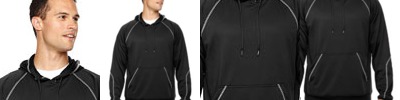 100% polyester brushed back fleece, 7.4 oz./yd2/250 gsm; Moisture wicking performance; Drawcord hood with metal cord ends; Spandex enhanced matching rib cuffs and waistband; Front hand warmer pouch pocket; Coverstitch details at hood, raglan, sleeves and pocket opening;