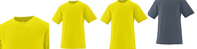 100% performance polyester interlock; Stain- and odor-resistant; Ultra tight knit resists snagging; Self-fabric narrow hemmed crewneck; Hemmed bottom and sleeve; Moisture management wicks away perspiration from the skin; The moisture evaporates quickly from the fabric surface;